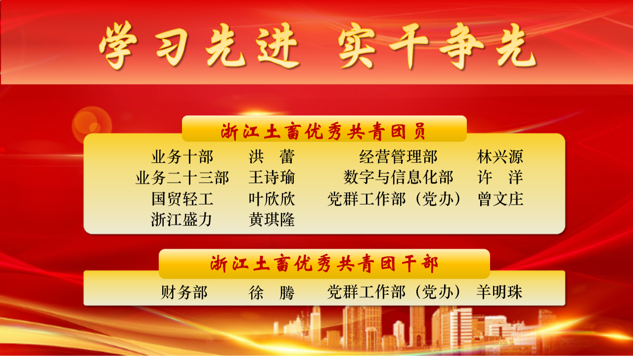 为表彰先进、树立榜样,激励公司各级团组织和广大团员青年比学赶超、奋勇争先,浙江土畜团委决定,对2024年度优秀共青团员、优秀共青团干部予以表彰。希望各级团组织和团员青年,要以受表彰的先进典型为榜样,学习他们对党忠诚、积极向上的政治本色,学习他们敢挑重担、冲锋在前的硬核担当,学习他们立足一线、创先争优的务实作风,学习他们遵规守纪、积极作为的职业操守。要大力传承和发扬土畜人“实干”的优良传统,在深度融入共同富裕、开放强省等重大战略中加快打造“国际供应链服务价值创造者”,贡献更多青春力量。