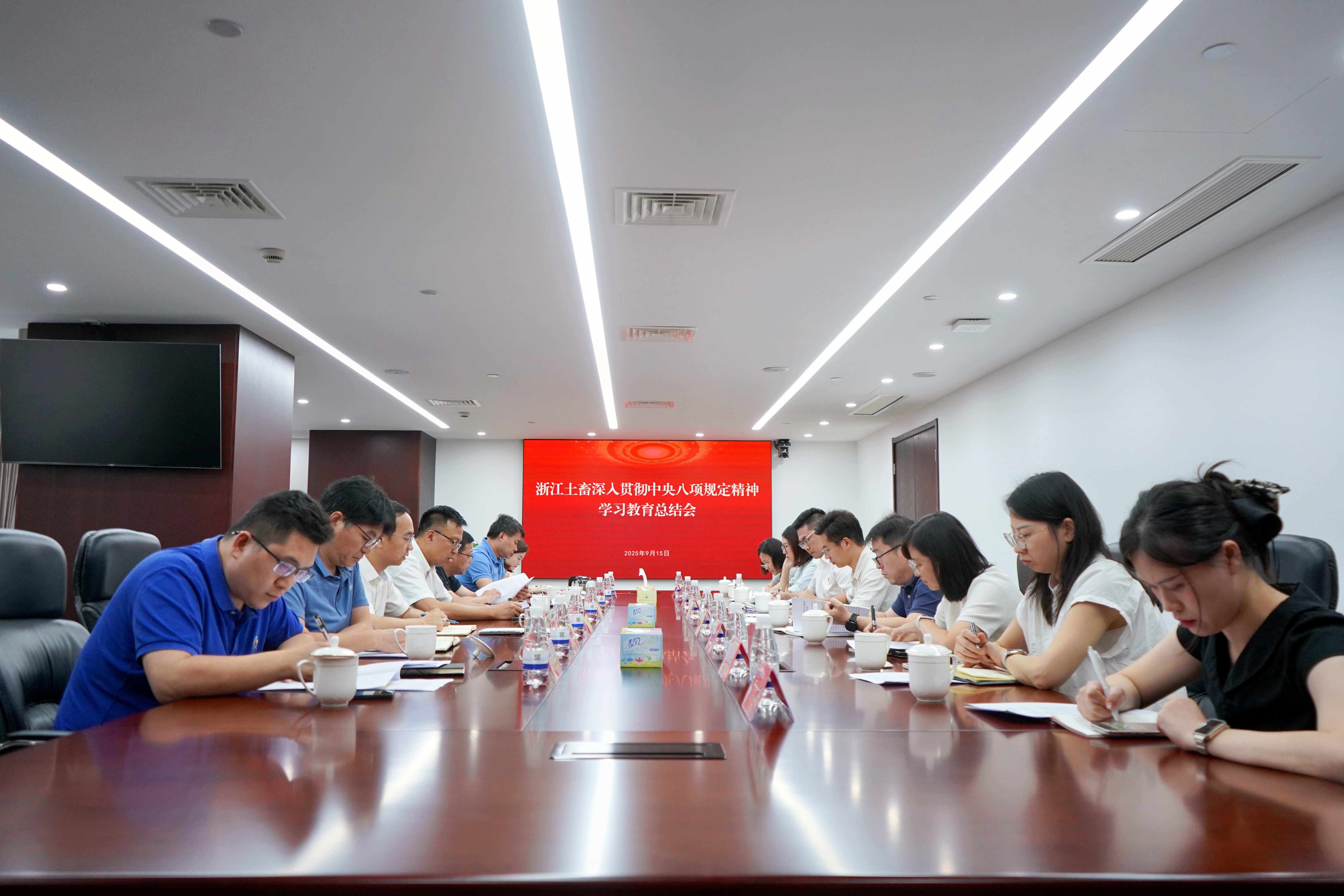 9月15日下午,浙江土畜党委召开深入贯彻中央八项规定精神学习教育总结会,传达学习习近平总书记关于深入贯彻中央八项规定精神学习教育的重要指示精神,贯彻落实省国贸集团学习教育总结会精神,总结公司学习教育工作,研究部署巩固拓展学习教育成果、推进作风建设常态化长效化工作。公司党委书记、董事长张斌主持会议并讲话,各支部书记、相关职能管理部室负责人参加会议。
